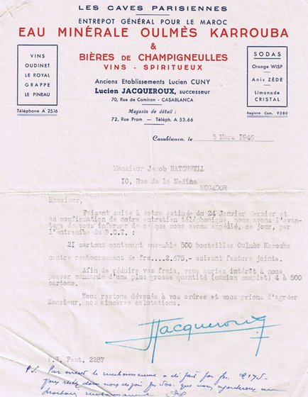 L. Jacqueroux, "Eau Minérale Oulmès Karrouba" de Casablanca