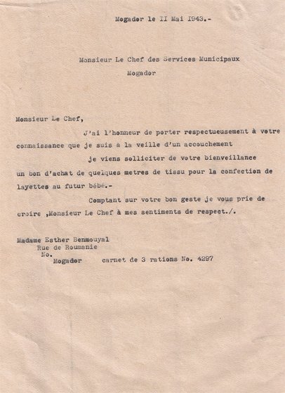 REQUÊTE PRÉSENTÉE LE 11/05/1943 AU CHEF DES SERVICES MUNICIPAUX DE MOGADOR