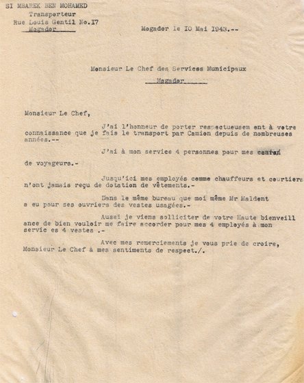 REQUÊTE PRÉSENTÉE LE 10/05/1943 AU CHEF DES SERVICES MUNICIPAUX DE MOGADOR