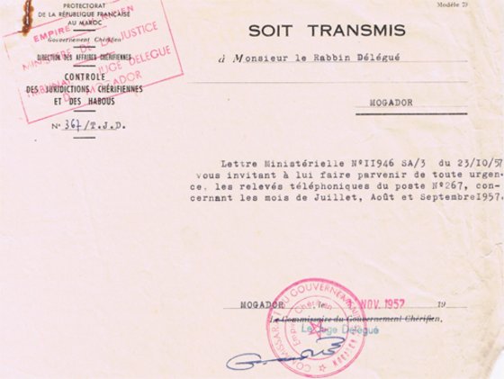 TRANSMIS ADRESSÉ LE 01/11/1957 AU RABBIN DÉLÉGUÉ DE MOGADOR