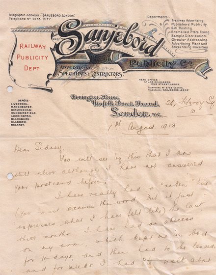 COURRIER ADRESSÉ LE 01/08/1913 À SIDNEY HATCHWELL
