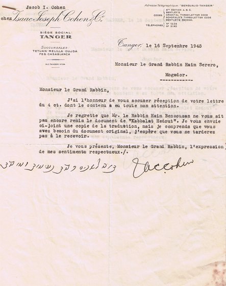 COURRIER ADRESSÉ LE 16/09/1945 AU GRAND RABBIN HAIM SÉRÉRO DE MOGADOR