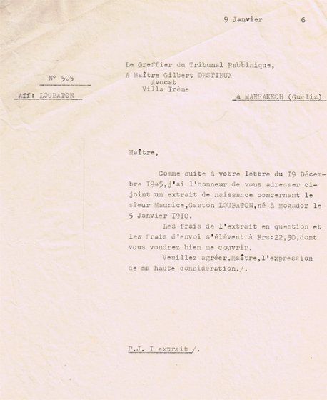 COURRIER ADRESSÉ LE 09/01/1946 À GILBERT DESTIEUX, AVOCAT À MARRAKECH