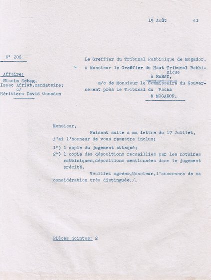 COURRIER ADRESSÉ LE 19/08/1941 AU GREFFIER DU HAUT TRIBUNAL RABBINIQUE DE RABAT