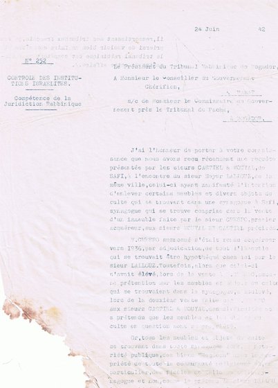 COURRIER ADRESSÉ LE 24/06/1942 AU CONSEILLER DU GOUVERNEMENT CHÉRIFIEN À RABAT
