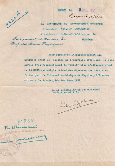 COURRIER ADRESSÉ LE 08/03/1932 À ABRAHAM BENSOUSSAN, PRÉSIDENT DU TRIBUNAL RABBINIQUE DE MOGADOR