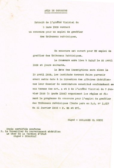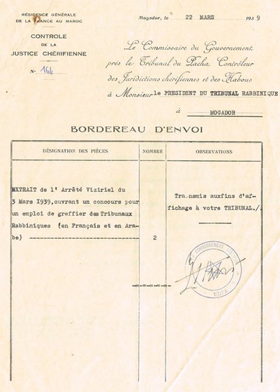 BORDEREAU D'ENVOI ADRESSÉ LE 22/03/1939 AU PRÉSIDENT DU TRIBUNAL RABBINIQUE DE MOGADOR