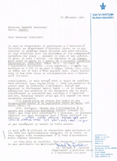 LETTRE ADRESSÉE LE 22/12/1981À RAPHAEL BENAZERAF DE PARIS