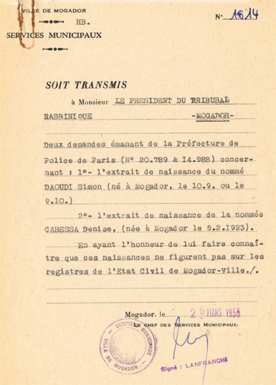 TRANSMIS ADRESSÉ LE 26/03/1953 AU PRÉSIDENT DU TRIBUNAL RABBINIQUE DE MOGADOR