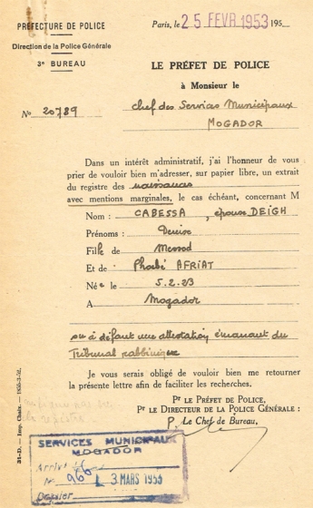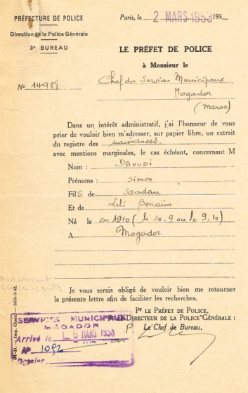 Courrier concernant deux demandes émanant de la préfecture de Paris: les extraits de naissance de Simon Daoudi et Denise Cabessa