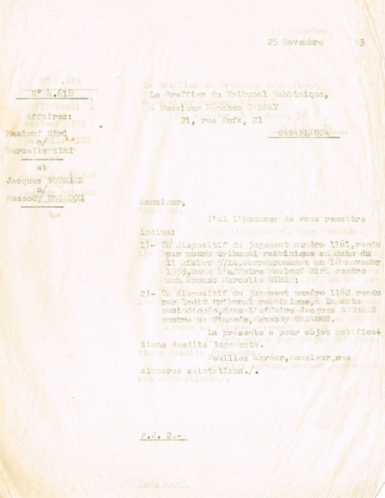 Courrier concernant les affaires Maclouf Ziri contre Marcelle Ziri et Jacques Soussan contre Messody Ossadon
