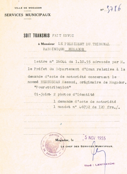 TRANSMIS ADRESSÉ LE 05/11/1955 AU PRÉSIDENT DU TRIBUNAL RABBINIQUE DE MOGADOR