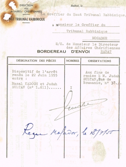BORDEREAU D'ENVOI DU 18/07/1955 ADRESSÉ AU GREFFIER DU TRIBUNAL RABBINIQUE DE MOGADOR