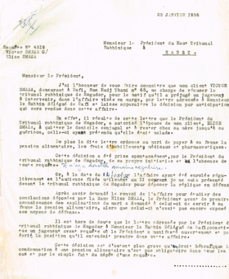 LETTRE ADRESSÉE LE 22/01/1956 AU PRÉSIDENT DU TRIBUNAL RABBINIQUE DE MOGADOR