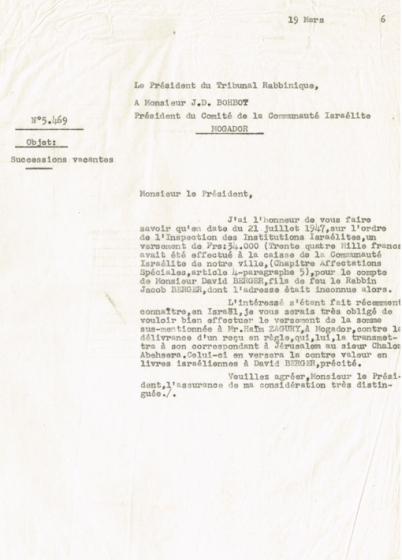 LETTRE ADRESSÉE LE 19/03/1956 À J.D. BOHBOT, PRÉSIDENT DU COMITÉ DE LA COMMUNAUTÉ ISRAÉLITE