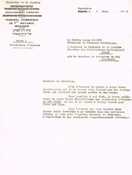 LETTRE ADRESSÉE LE 02/03/1959 AU MINISTRE DE LA JUSTICE À RABAT