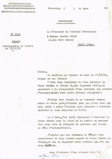 Courrier concernant le divorce entre Yvette Hazan et Nessim Elharrar