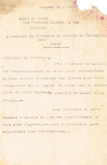 LETTRE ADRESSÉE LE 03/04/1951 AU DIRECTEUR DU SERVICE DU RAVITAILLEMENT À RABAT