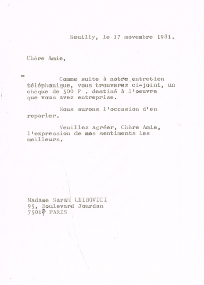 LETTRE ADRESSÉE LE 17/11/1981 À SARAH LEIBOVICI DE PARIS