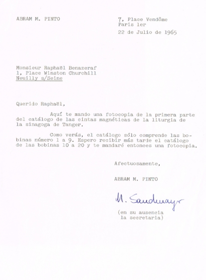 LETTRE ADRESSÉE LE 22/07/1965 À RAPHAEL BENAZERAF DE NEUILLY-SUR-SEINE