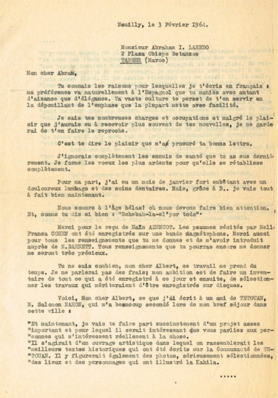 LETTRE ADRESSÉE LE 03/02/1964 À ABRAHAM LAREDO DE TANGER