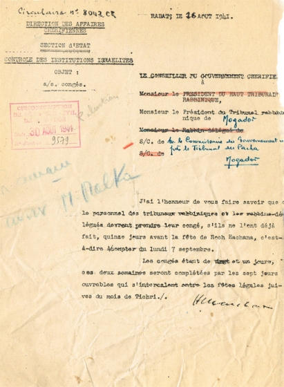 LETTRE ADRESSÉE LE 16/08/1941 AU PRÉSIDENT DU TRIBUNAL RABBINIQUE DE MOGADOR