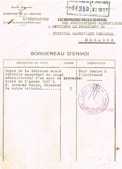 BORDEREAU D'ENVOI ADRESSÉ LE 29/10/1957 AU PRÉSIDENT DU TRIBUNAL RABBINIQUE DE MOGADOR