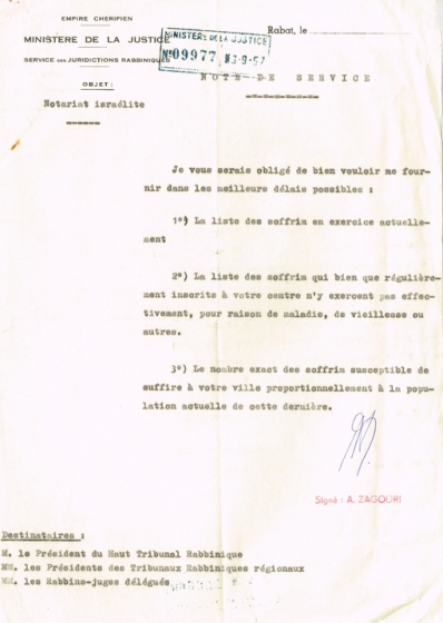 NOTE DE SERVICE ADRESSÉE LE 13/09/1957 AUX TRIBUNAUX RABBINIQUES