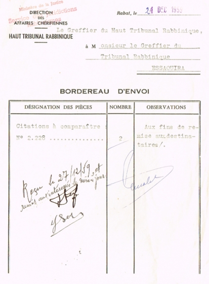 BORDEREAU D'ENVOI ADRESSÉ LE 24/12/1959 AU GREFFIER DU TRIBUNAL RABBINIQUE DE MOGADOR