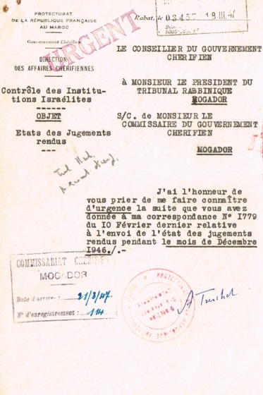 LETTRE ADRESSÉE LE 18/03/1947 AU PRÉSIDENT DU TRIBUNAL RABBINIQUE DE MOGADOR