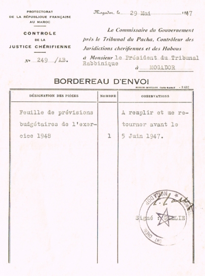 BORDEREAU D'ENVOI ADRESSÉ LE 29/05/1947 AU PRÉSIDENT DU TRIBUNAL RABBINIQUE DE MOGADOR
