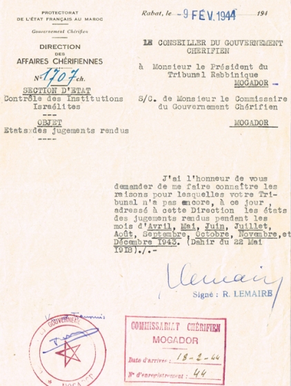 LETTRE ADRESSÉE LE 09/02/1944 AU PRÉSIDENT DU TRIBUNAL RABBINIQUE DE MOGADOR
