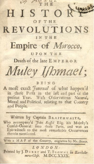 1729. Braithwaite, John. – The History of the Revolutions in the Empire of Morocco, upon the death of the late Emperor Muley Ishmael; being a most exact Journal of what happen'd in those parts in the last and part of the present year. With Observations Natural, Moral and Political relating to that country and People. With a map of the country engraven by Mr. Senex. London: 8vo, pp.381