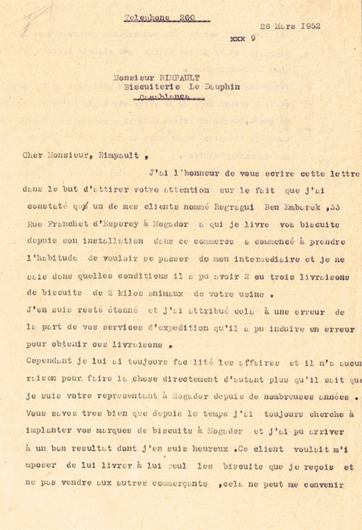 LETTRE ADRESSÉE LE 26/03/1952 À MR RIMPAULT DE LA BISCUITERIE LE DAUPHIN