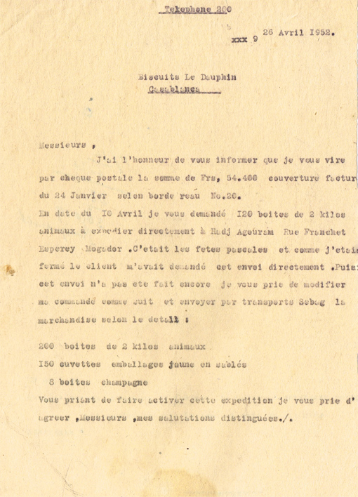 LETTRE ADRESSÉE LE 26/04/1952 À LA BISCUITERIE LE DAUPHIN DE CASABLANCA