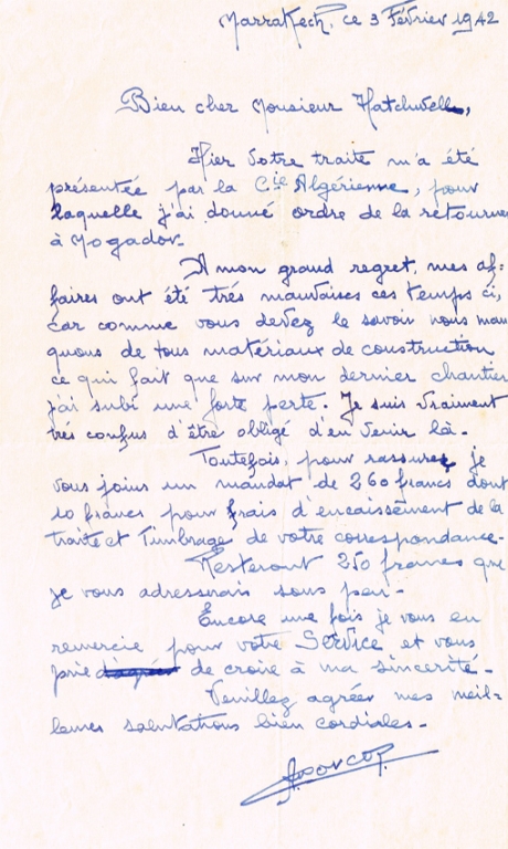 LETTRE ADRESSÉE LE 03/02/1942 À JACOB HATCHWELL