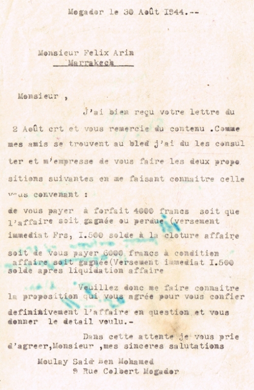 LETTRE ADRESSÉE LE 30/08/1944 À FÉLIX ARIN DE MARRAKECH
