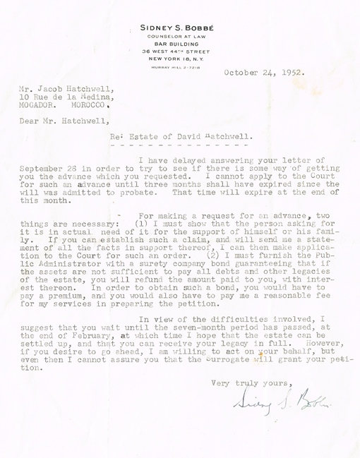 LETTRE ADRESSÉE LE 24/10/1952 À JACOB HATCHWELL