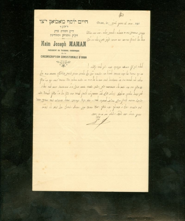 מכתב ליצחק ן' וואליד לטאנכיר ובו אומר שלכד ברשת אניית צרפת שטבעה בים ומזכיר את ברוך ואת שמעון ואומר שבישר לבני ביתו של ברוך לעסרי שהגיא לאוראן ווהראן והיה זה י"ז אב אעת"ר וחתום חיים יוסף מאמאן