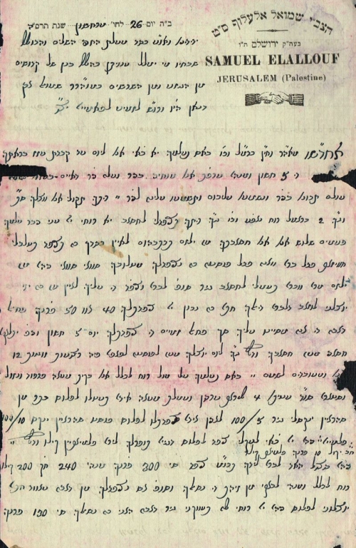 מכתב לשמואל אבן דנאן ובו כותב שקיבל את יקר מכתבו היום בתאריך 5 סיון וממנו נודע לו שמצבו בטוב ומבקש ממנו לא לבקש ממנו בכל מכתב דבר נוסף אלא לרכז הכול ולבקש הכול בפעם אחת כי הוא לא יכול לשלוח לאט לאט ומזכיר חבילות ששלח לו בתאריך 5 סיון ותיבה ובה רצועות מעובדים לשמם ומזכיר ספר קינות שיגיע אליו ומזכיר שמישהו היה אצלו ושאל למי שייכת הקינה הזאת והתפלא מאוד ירושלים והיה זה 26 מרחשוון שנת תרס"ה וחתום שמואל אלעלוף