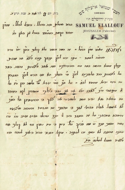 מכתב לשמואל אבן דנאן ובו מתלונן על העיכוב בתשובות שמקבל ממנו ומקווה שהעיכוב לטובה ואומר לו שיגיע אליו חבילה ובה שני זוגות תפילין מעור אמתי בהמה גסה עם המעברתא וזוג אחד רצועות ועל ענין ספר התורה שעל ידי שלמה כהן של אחד מתושבי צפרו ואומר לו שהוא לא יוותר על הקומינסיון שלו אפילו על פרוטה ירושלים והיה זה יום 3 לחודש אדר ב' שנת תרע"ג וחתום שמאול אלעלוף