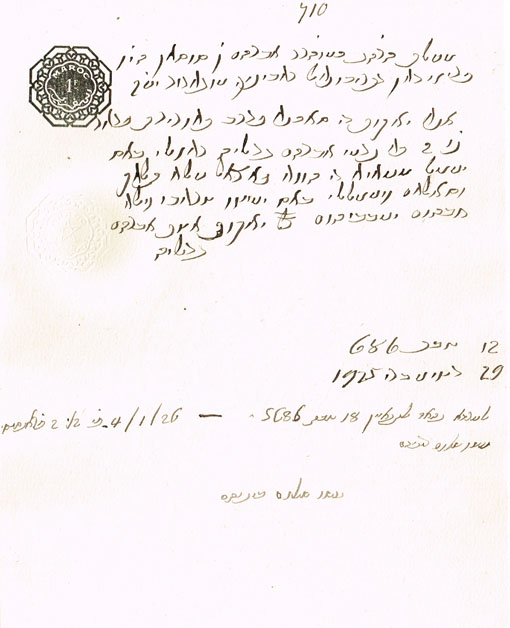 פניה לאברהם ן' סוסאן ראב"ד מוגאדור של יאקות ובה תובעת את אברהם גדליה בעלה שיעשה עמה הסכם על הגירושין וייתן לה את הילדים ואם רוצה אותם שייקח אותם והיה זה 12 טבת 686 29/12/1925 וחתומה יאקות אשת אברהם גדליה ולמטה כתוב ההזמנה יום שני 18 טבת 5686 4/1/26 וכתוב עשו שלום ביניהם