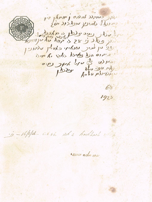 פניה לאברהם ן' סוסאן ראב"ד מוגאדור של מזל אשת נסים יפרגאן ובה תובעת את נסים בעלה שאינו מפרנס אותה ומגרש אותה מהבית וחפציה כולם ממושכנים ודורשת שורת הדין והיה זה 686 1926 וחתומה מזל אשת נסים יפירגאן ולמטה כתוב ההזמנה יום שלישי 2 אדר 5686 16/2/26 וכתוב עשו שלום ביניהם