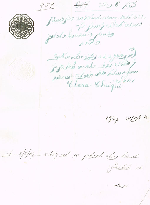 פניה לאברהם ן' סוסאן ראב"ד מוגאדור ובה מבקשת החתומה בלועזית להזמין את סוליפ' ן' סללאם להגיע לבית דין לדון עמה בדברים שיש ביניהם והיה זה 2/8/1927 וחתומה בלועזית ולמטה כתוב שההזמנה נקבעה ליום שני 10 אב 5687 8/8/27 ועוד כתוב למטה נתגרשה