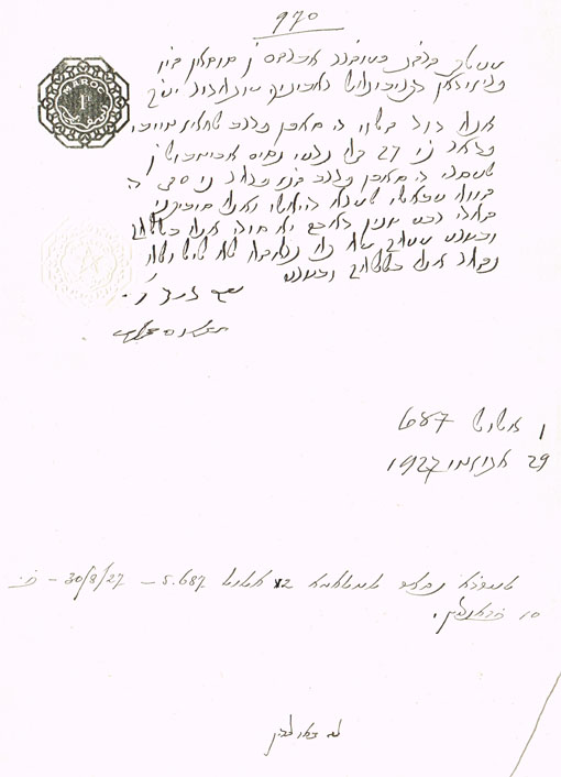פניה לאברהם ן' סוסאן ראב"ד מוגאדור של דוד הלוי ובה הוא תובע את נסים אביטבול ן' לעסרי שהוא לקח את אשתו והיא סידרה אותו זה כבר ארבע שנים ולכן הוא דורש שורת הדין והיה זה 1 אלול 687 28/8/1927 וחתום דוד ן' שלום הלוי ולמטה כתוב שההזמנה נקבעה ליום שלישי 2 אלול 5687 30/8/27 ועוד כתוב לא בו לדין