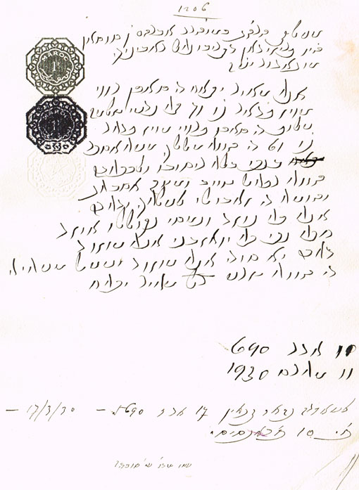 פניה לאברהם ן' סוסאן ראב"ד מוגאדור של מאיר יתאח ובה תובע את שלמה עלוף שהוא מאורס עם אסתר בתו בלא אישור ורפאל טייב ומשה אסבאג הם שהביאו האירוסין וכעת הוא מכין ודורש שגם הארוס יכין לכן תובע אותו לבית דין ולמטה כתוב שההזמנה נקבעה ליום שני 17 אדר 5690 17/3/30 והיה זה 10 אדר 690 11/5/1930