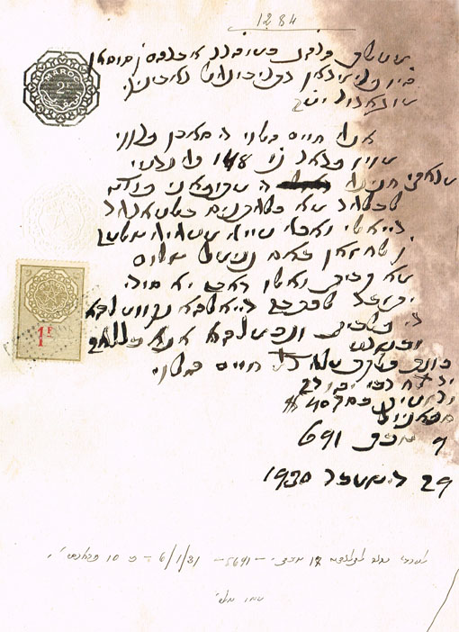 פניה לאברהם ן' סוסאן ראב"ד מוגאדור של חיים הלוי ובה תובע את חנינא אשתו שמביישת אותו בתוך העיר ואינה מניחה אותו בכבודו וכבר התיייאש ממנה שלמה ן' לחזאן מלעשות שלום וכעת דורש שתמחול לו כתובתה וייתן לה חפצי הבית במקומה ומציין בצד שכבר התגרש ממנה על ידי רבי יהודה וחזרה בסך מה כסף ספרדי והיה זה 9 טבת 691 29/12/1930 וחתום חיים הלוי ולמטה כתוב ההזמנה יום שלישי 17 טבת 5691 6/1/31 וכתוב עשו שלום
