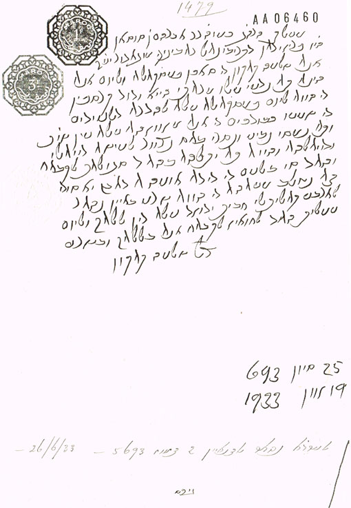 פניה לאברהם ן' סוסאן ראב"ד מוגאדור של שלמה קאקון תושב מסקאלא וכעת כאן ובה תובע את עלו אשתו ואת דוד קרספין תושב מסקאלא על הדברים של העדים ששמעו בבית הדין והוא הולך למשא ומתן כדי לפרנס את עצמו ואותה והיא עושה דברים רעים אלו וזה בידיעת דידא אמה וכעת דורש שורת הדין והיה זה 25 סיון 693 19/6/1933 וחתום שלמה קאקון ולמטה כתוב ההזמנה יום שני 2 תמוז 5693 26/6/33 וכתוב גירש
