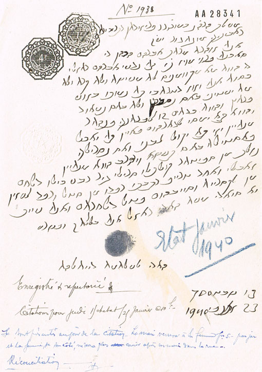 פניה לראב"ד מוגאדור של זוהרא אשת אברהם הכהן ובה תובעת את אברהם בעלה שאינו מפרנס אותה היא ושני ילדיה מתים ברעב וכאשר יצאה מבית החולים ביקשה ממנו שיקנה לה חתיכת בשר של רבע קילו והביא לה חתיכה קטנה ועד שהשרתה אותה במים לקח אותה מהדלי ולקח את הבצק וזרק אותם במקום האיסור והיא עייפה ודורשת שורת הדין והיה זה 13 שבט 700 23/1/1940 וחתומה בטביעת אצבע וליד טביעת האצבע כתוב זוהי חתימתה