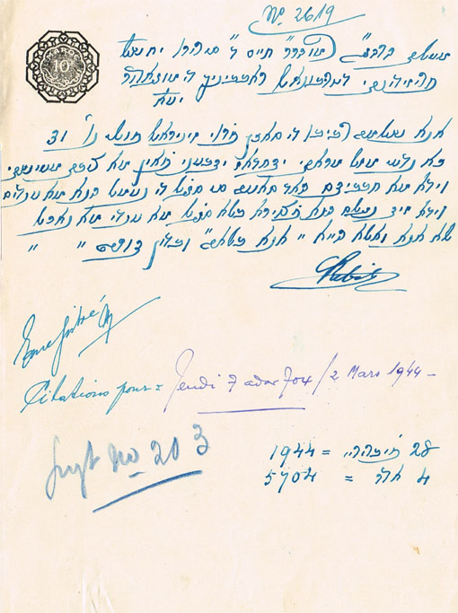 פניה לחיים ד' סירירו ראב"ד מוגאדור של שלמה רביבו שבה תובע את מזל אשתו שחייבת ללכת עמו היכן שימצא פרנסתו ואינו רוצה להיות בצוירא והיה זה 28/2/1944 4 אדר 5704 וחתום בלועזית